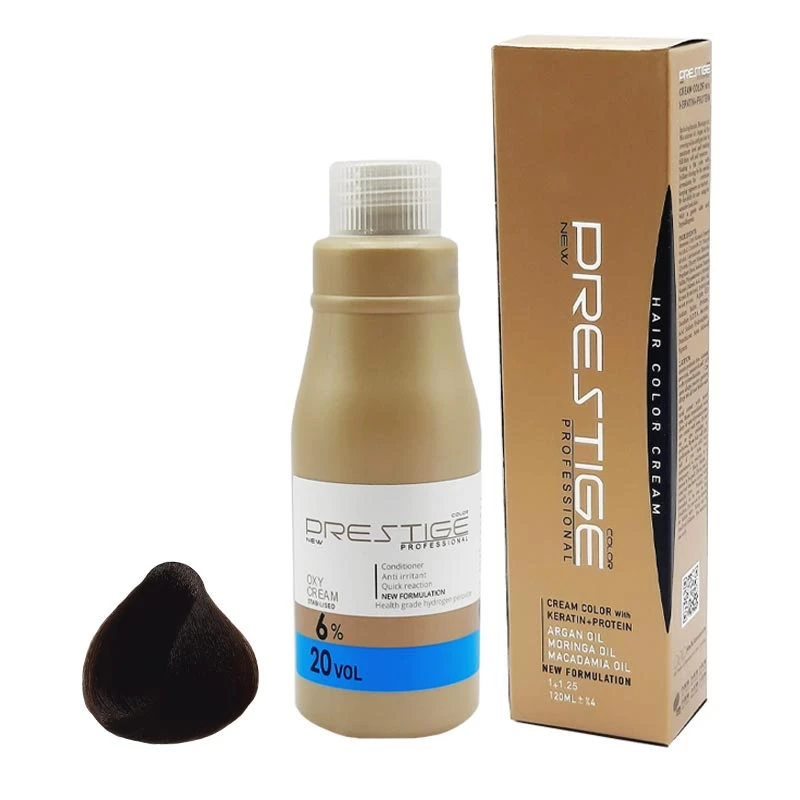 رنگ مو نیو پرستیژ کالر شماره 4.65 حجم 120 میلی لیتر رنگ قهوه ای فندقی متوسط به همراه اکسیدان مدل 1 شش درصدی حجم 150 میلی لیتر