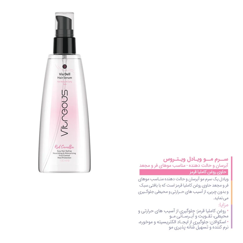 سرم مو ویادل ویتروس یک سرم موی آبرسان و حالت دهنده مناسب موهای فر و مجعد حاوی روغن کاملیا قرمز است که با بافتی سبک و بدون چربی, از آسیب های حرارتی و محیطی جلوگیری مینماید.