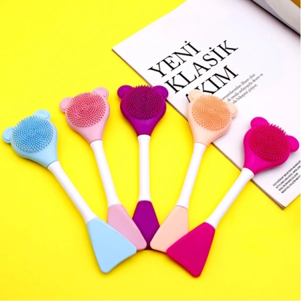 براش ماسک زنی و فیس براش طرح خرسی دارای هر دو سر سلیکونی و دسته پلاستیکی میباشد که یک سر آن مناسب برای ماسک زدن روی پوست و سر دیگر آن جهت شستشو و ماساژ کاربرد دارد. هر دو سر براحتی قابل شستشو هستند و دارای رنگهای سرخابی، بنفش، گلبهی ، صورتی و آبی میباشند.