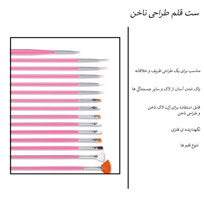 پک قلم طراحی ناخن شامل 15 قلم در انواع مدل های مورد نیاز برای طراحی حرفه ای را شامل می شود.این پک شامل 5 سایز قلم لاینر، 4 سایز قلم سر تخت، یک سایز قلم سرکج دو سایز قلم 3D ، دو قلم بادبزنی و یک سایز قلم داتینگ است. وجود چند سایز مختلف در هر مدل، این پک را برای طراحی های حرفه ای مناسب می سازد. قلم لاینر، برای کشیدن خطوط صاف در طراحی مناسب است. قلم بادبزنی، برای استفاده از پک دیزاین پودری و sugarمناسب است. با استفاده از قلم بادبزنی میتوان روی لاک نیمه خشک شده ناخن، طرح ابر و باد ایجاد کرد. قلم سر تخت و سرکج، برای طراحی های ظریف مانند گل، چهره و … روی ناخن مناسب است.قلم 3D، برای استفاده در کاشت ناخن مناسب ترین قلم است.قلم داتینگ، برای ایجاد نقطه و یا کشیدن گل و انواع طرح بوسیله نقطه گذاری مناسب است. دقت کنید بعد از استفاده از تمام قلم مو ها، آنها را بلافاصله تمیز نمایید. ماندن مواد طراحی روی قلم به مرور باعث ریزش موهای قلم مو خواهد شد.