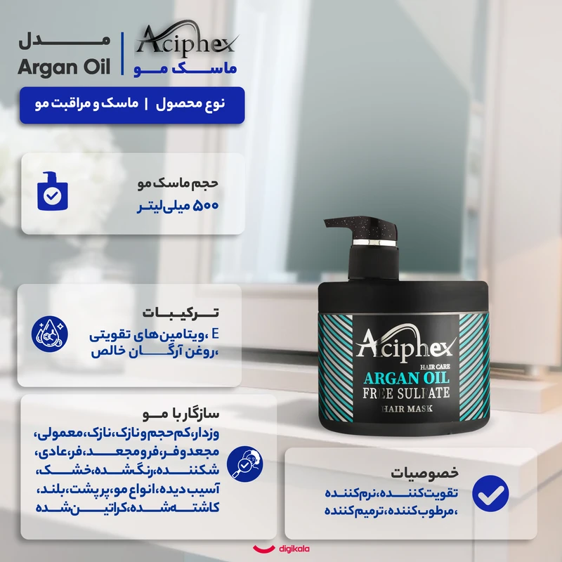 ماسک موی داخل حمام حاوی روغن آرگان Aciphex یک درمان ایده‌آل برای موهای خشک، آسیب‌دیده، رنگ‌شده و وزدار است. این ماسک با فرمولاسیون غنی خود، ترکیبی از روغن آرگان خالص، کراتین هیدرولیز شده، شی باتر، روغن آووکادو و عصاره آلوئه‌ورا را در اختیار موهای شما قرار می‌دهد تا آن‌ها را عمیقاً تغذیه و ترمیم کند. روغن آرگان، که به طلای مایع معروف است، سرشار از ویتامین E و اسیدهای چرب ضروری بوده و به موها لطافت، درخشندگی و نرمی می‌بخشد. این ماسک با خاصیت آبرسانی عمیق، از شکنندگی و موخوره جلوگیری کرده و موهایی نرم، سالم و ابریشمی برای شما به ارمغان می‌آورد. به دلیل عدم وجود سولفات، پارابن و نمک، این محصول گزینه‌ای ایده‌آل برای افرادی است که موهای خود را کراتینه کرده‌اند یا به دنبال یک ماسک موی سالم و بدون ترکیبات مضر هستند. ماسک موی روغن آرگان Aciphex نه‌ تنها به ترمیم موهای آسیب‌دیده کمک می‌کند، بلکه با ایجاد یک لایه محافظتی، موها را در برابر عوامل آسیب‌زای محیطی مانند آلودگی، حرارت و مواد شیمیایی حفظ می‌نماید. استفاده منظم از این محصول، باعث احیای سلامت مو شده و موهایی لطیف، خوش‌حالت و درخشان را برای شما به ارمغان خواهد آورد. برای استفاده، کافی است پس از شست‌وشوی موها، مقدار مناسبی از ماسک را روی ساقه موها قرار داده، 5 تا 7 دقیقه صبر کنید و سپس آبکشی نمایید.
