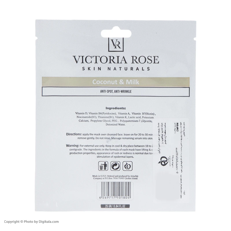 ماسک صورت ویکتوریا رز مدل شیر و نارگیل حجم 25 میلی لیتر