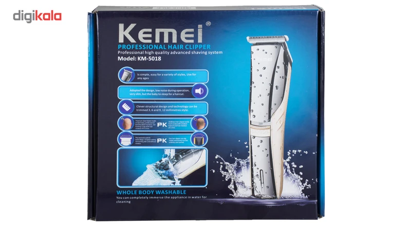ماشین اصلاح «کیمی» مدل «KM-5018» دستگاهی برای اصلاح موهای سر و صورت مجهز به باتری قابلشارژ و کاملا ضد اب است. سر اصلاح ماشین به شکل تریمر بوده که از دو تیغهی فلزی لغزان روی یکدیگر تشکیل شده است. فاصلهی بین این دو تیغه، طول اصلاح را تعیین میکند. طول اصلاح تیغه ثابت و برابر 0.5 میلیمتر است. وزن آن 160 گرم است. برای اینکه بتوان موهای صورت را در اندازههای بیشتر از 0.5 میلیمتر کوتاه کرد، میتوان از شانهی ارائهشده همراه دستگاه استفاده کرد. انرژی ریشتراش کیمی از باتری قابلشارژ آن تأمین میشود. مدتزمان شارژ کامل باتری 8ساعت و زمان شارژدهی آن 50 دقیقه است. میتوان زیر دوش از دستگاه استفتده کرد. برای افزایش عمر تیغهها بهتر است پس از هر بار استفاده، خردههای مو را توسط برس تمیز کرده و توسط روغن موجود در جعبه، تیغهها را روغنکاری کنید. بهطور خلاصه ریشتراش KEMEI KM-5018دارای تیغهی تریمر با عرض 25 میلیمتر، طول اصلاح 0.5 میلیمتر، باتری قابلشارژ 4شانه سایزهای 3-6-9-12 بوده و برای اصلاح موهای سر و صورت مناسب است