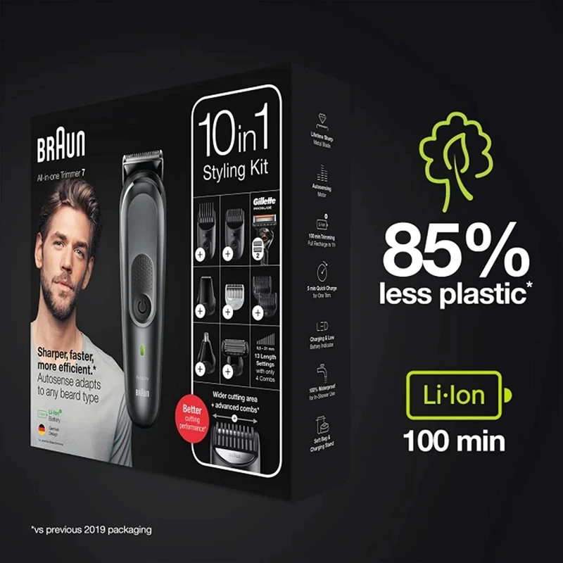 با ماشین اصلاح شارژی 10 کاره MGK7، از سر تا پا بر اصلاح خود مسلط شوید. این ماشین اصلاح ریش، مراقبت از بدن و اصلاح مو، تیزتر، سریعتر و کارآمدتر است – با سطح اصلاح وسیعتر که با هر حرکت، موهای بیشتری را میگیرد و کوتاه میکند (در مقایسه با ماشینهای اصلاح قبلی براون). موتور AutoSense MGK7 ریشهای ضخیم و نازک را کوتاه میکند. این ماشین اصلاح دارای 13 طول (0.5-21 میلیمتر) و تیغههای فلزی تیز مادامالعمر است، بنابراین همیشه میتوانید به راحتی به مدل دلخواه خود برای ریش، مو و بدن خود برسید.