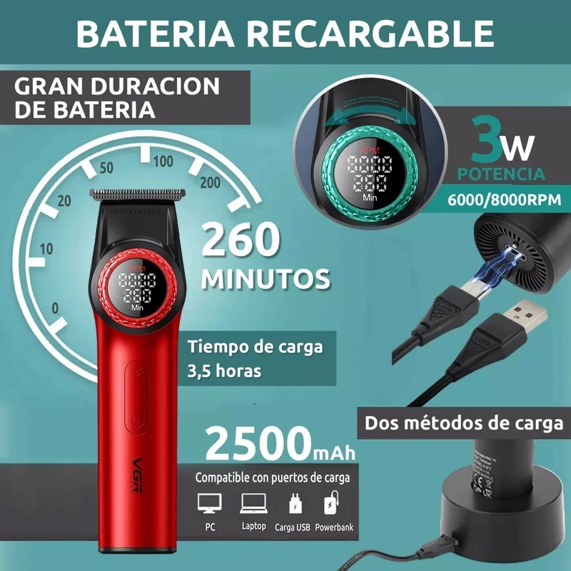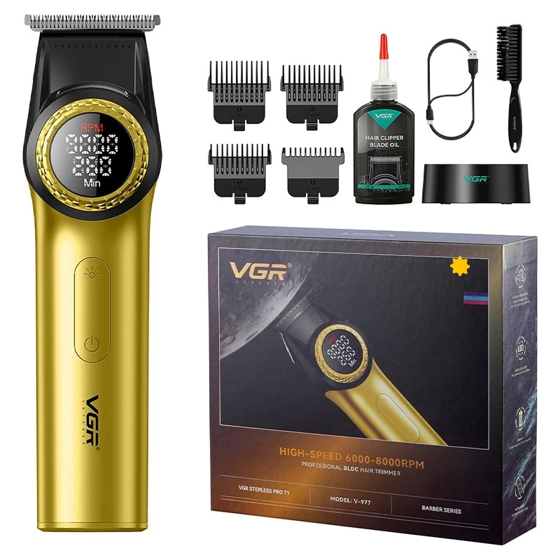 ماشین اصلاح سر و صورت وی جی آر مدل V-977 بسته دوتایی یک پیرایشگر حرفه ای از محصولات برند VGR است. این تریمر وی جی آر دارای 4 شانه اصلاح در سایزهای متنوع می باشد. جنس تیغه‌ها از سرامیک با روکش DLC بسیار تیز و بادوام هستند. تریمر V-977 وی جی آر دارای باتری قابل شارژ 2500 میلی آمپر است. شارژ کامل باتری در مدت زمان 3.5 ساعت انجام می شود. پس از شارژ کامل باتری 260 دقیقه کارکرد مداوم دارد. امکان تنظیم قدرت موتور نیز با توجه به ضخامت و تراکم مو وجود دارد. قدرت موتور این تریمر 8000 دور در دقیقه است. با وجود موتور قدرتمند و تیغه های تیز اصلاح کامل موهای سر، صورت و بدن براحتی و یکنواخت در کمترین زمان انجام می شود. صفحه نمایش LED روی بدنه میزان شارژ باتری و سرعت دستگاه را نمایش می دهد. این محصول برای استفاده حداکثر از قدرت موتور حین کار به حالت توربو نیز مجهز است. امکان استفاده و اتصال آسان شانه های اصلاح، موتور قوی و تیغه نیز استفاده از دستگاه را در منزل و سالن های آرایش آسان می کند.