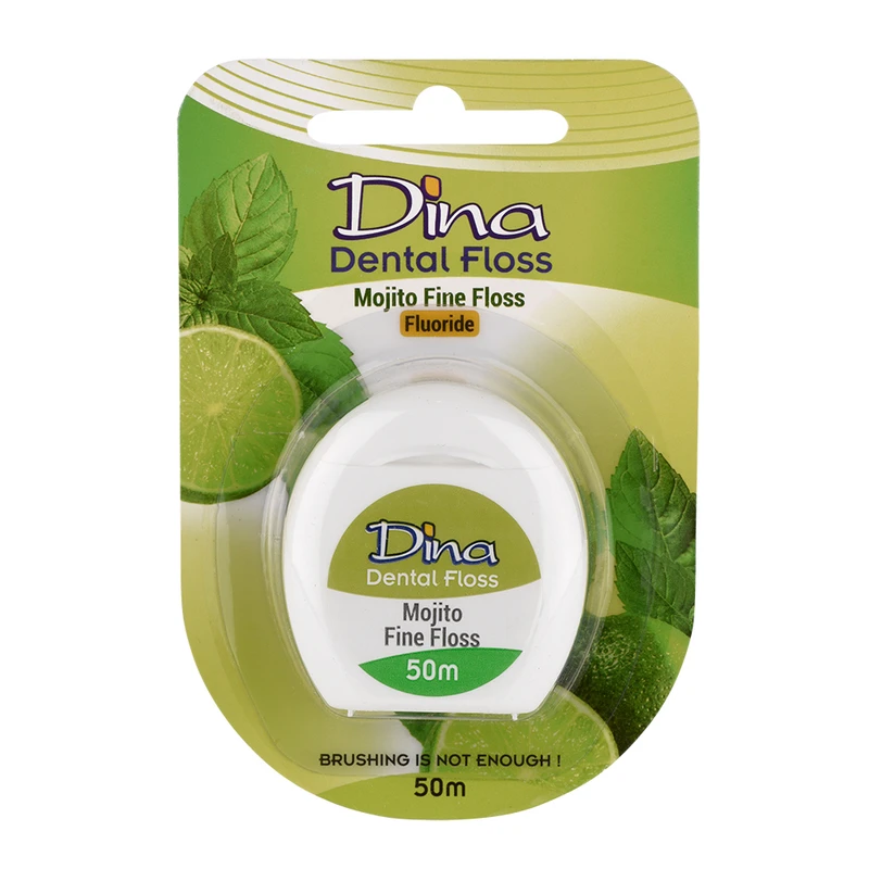 نخ دندان دینا با بافت ظریف و مقاوم و پوشش موم و اسانس طبیعی به راحتی روی لثه و بین دندانها سر خورده و پلاکهای دور از دسترس را جدا و تمیز می نماید . فلوراید اضافه شده به نخ دندان باعت بازسازی و استحکام مینای دندان می شود.