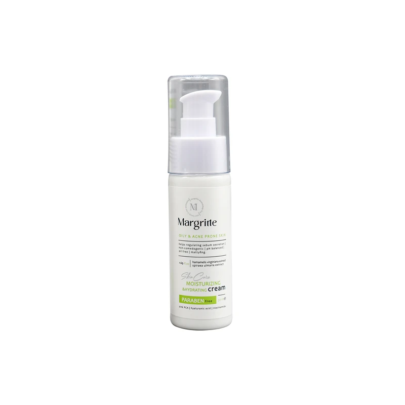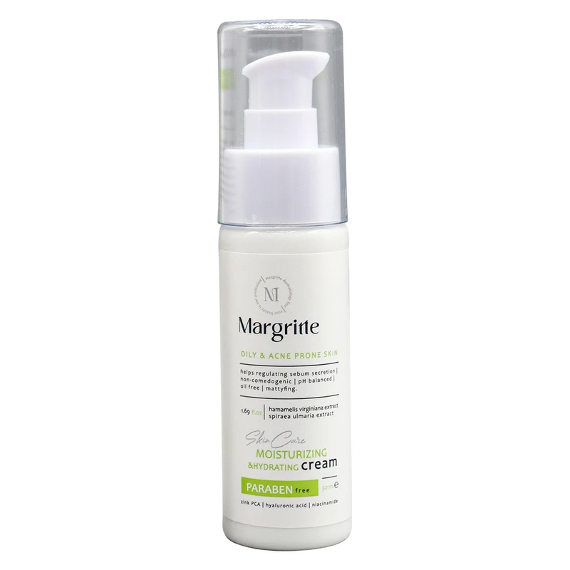 کرم مرطوب کننده و آبرسان پوست چرب و مستعد آکنه مارگریت حاوی هیالورونیک جهت آبرسانی عمیق پوست است. همچنین به دلیل دارا بودن عصاره های هاماملیس، اسپیریا اولماریا و زینک پی سی ای، ترشح چربی پوست را کنترل و رشد باکتری های مولد آکنه را متوقف میکند. این کرم با دارا بودن مواد آنتی اکسیدانی قوی از ایجاد چین چروک پیشگیری خواهد کرد. سرشار از اسیدهای چرب ضروری است که پوست تغذیه کرده و از پوست در مقابل رادیکال های آزاد محافظت مینماید.